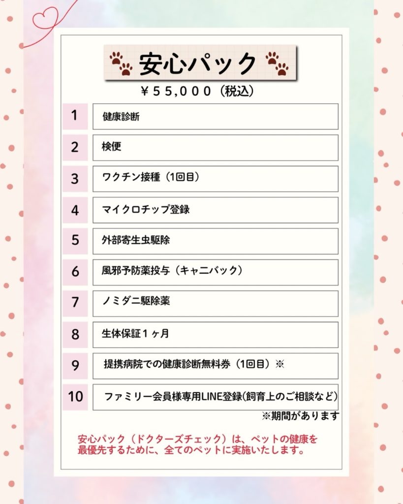 ※「生体価格とは別に、ワンちゃんの健やかな成長をサポートするための『安心パック』代金を別途頂戴しております